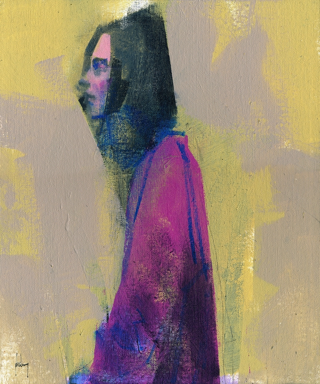 This painting is from a series of works studying human form fusing a range of diverse influences (graffiti; comic book; traditional), colour experimentation and dynamic mark-making.